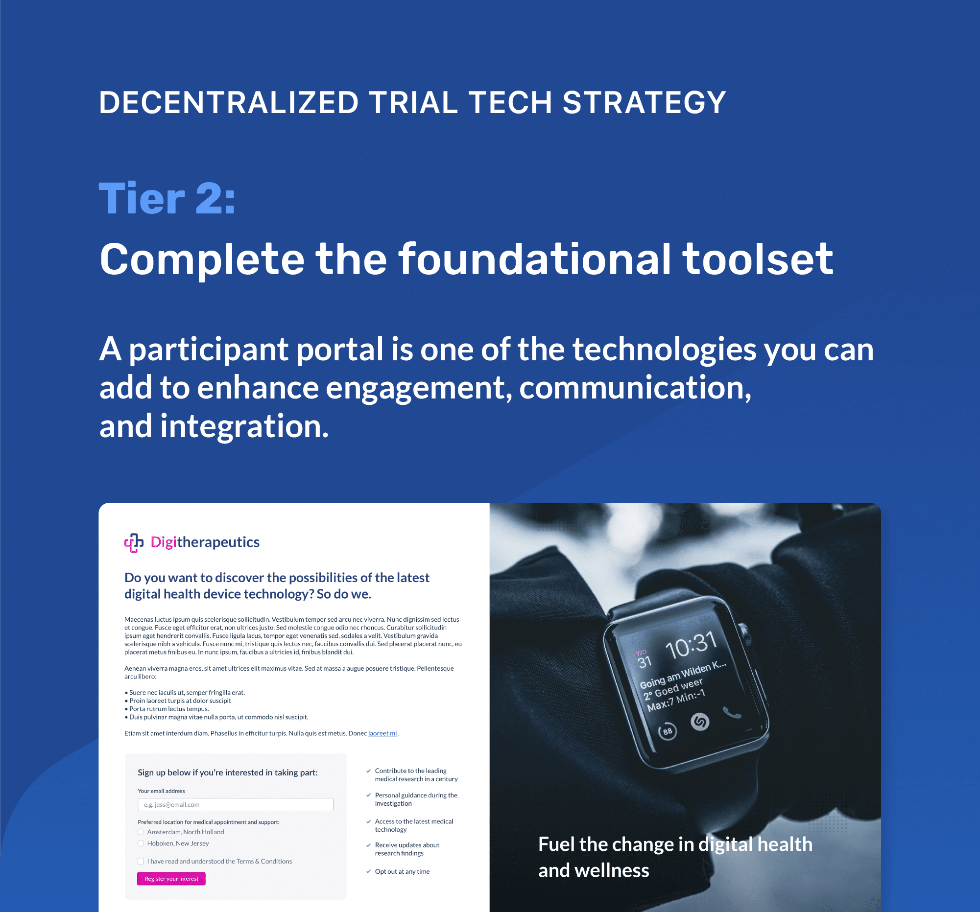 You can start a decentralized trial with two technological building blocks to support participant consent and report their trial data: