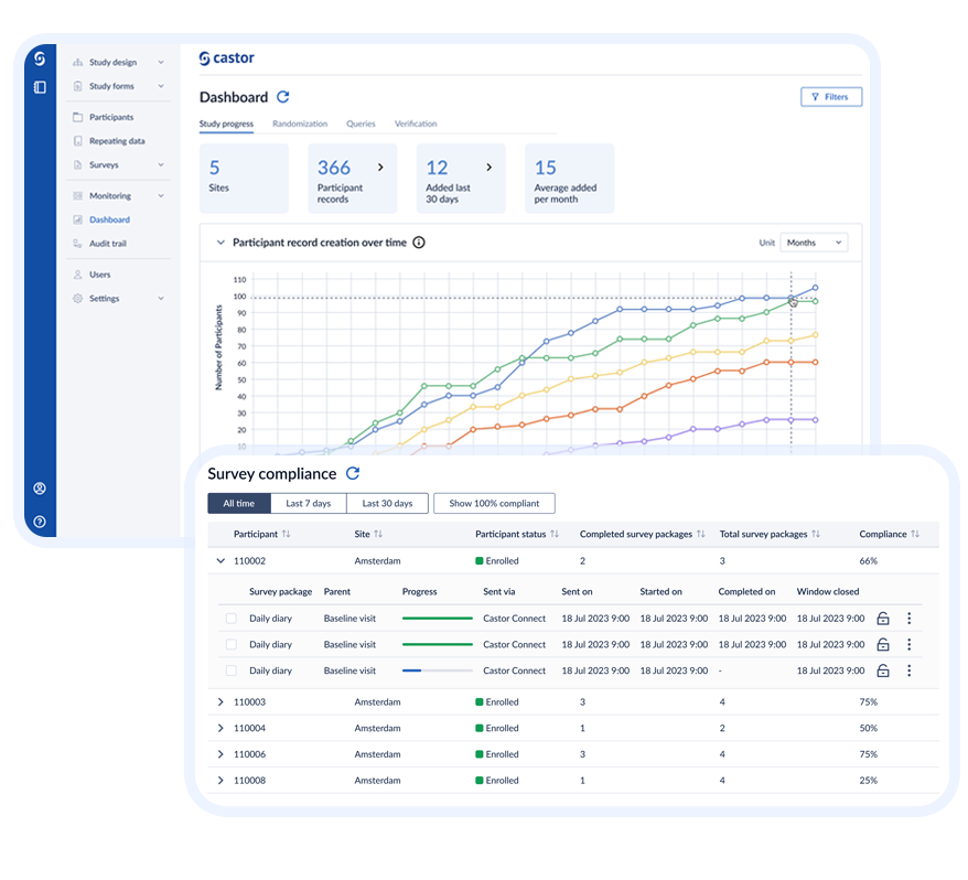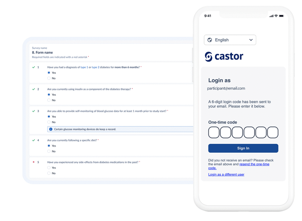 Castor’s eCOA / ePRO is not a separate add-on—it’s natively integrated with our EDC, eConsent, and eCOA platform. All participant data flows seamlessly into a single system in real-time—no third-party syncs, no manual uploads, no fragmented data.
